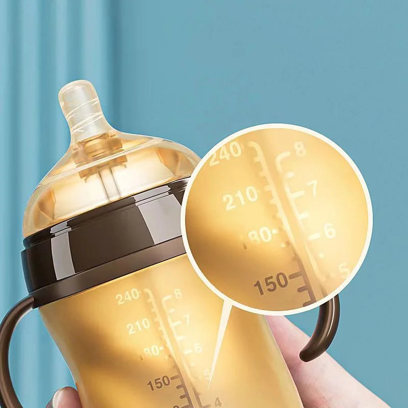 An unbreakable silent milk bottle made of stable material, resistant to drops and high temperatures, and not worried about scaring the baby even if dropped on the ground.