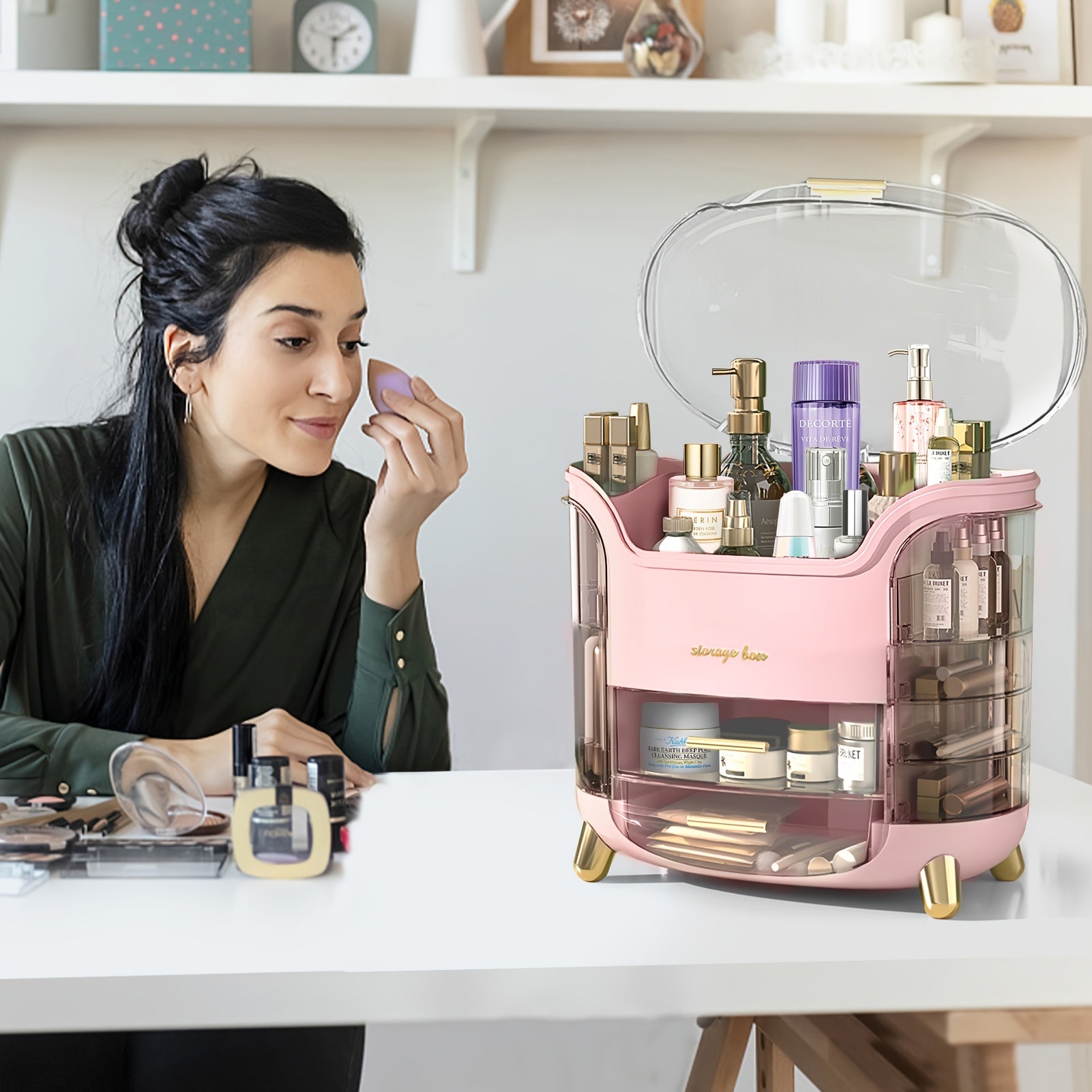 Keep your cosmetics safe from dust and moisture by placing this item in the bathroom or bedroom. It features a clear lid and drawers for organizing items such as lipsticks, makeup brushes, eyebrow pencils, foundation sticks, beauty gadgets, necklaces, and rings.
